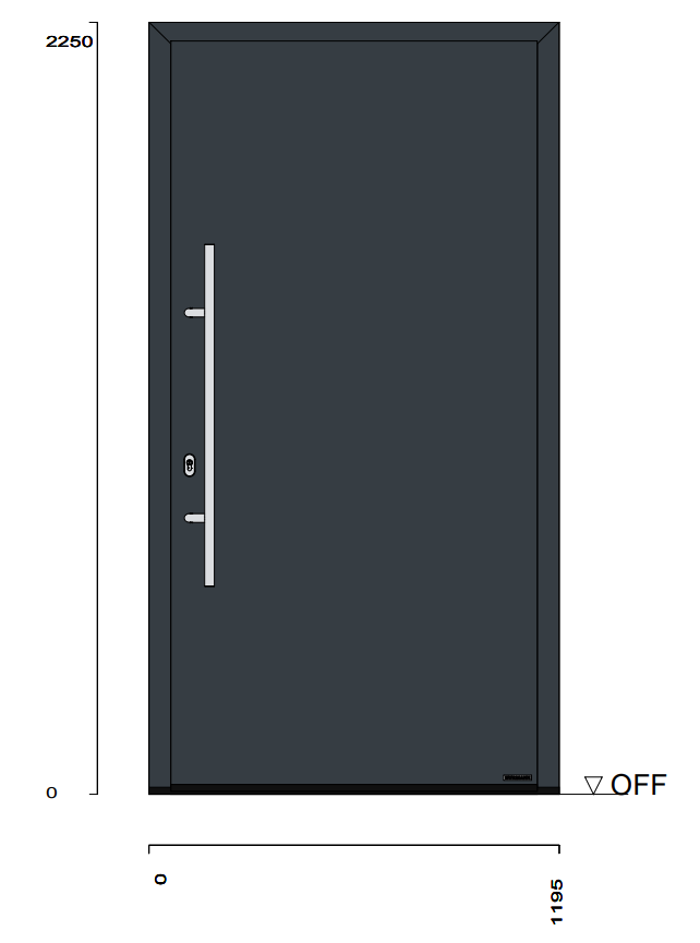 - Wymiar zewnętrzny ramy: 1195 x 2250 mm, jednoskrzydłowe, montaż lewy (DIN L), otwierane do wewnątrz.