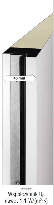 - Pełne skrzydło stalowe z grubą przylgą, profil skrzydła z kompozytu, izolujący rdzeń z pianki twardej PU, grubość skrzydła 46 mm.