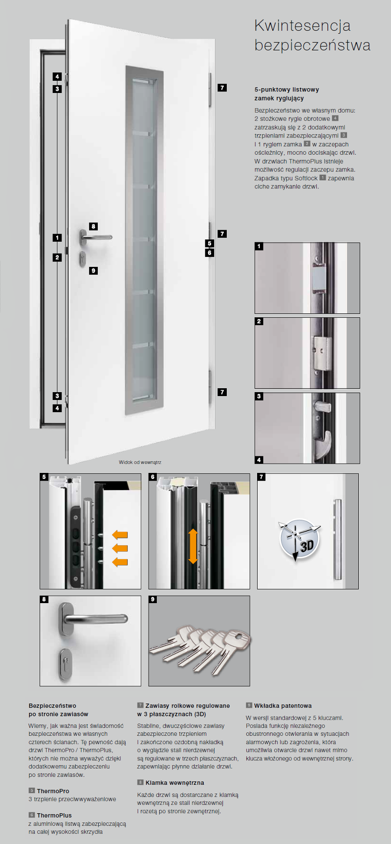 - Ryglowanie wielopunktowe z zamkiem głównym (zapadka typu Softlock) i dwoma trzpieniami, połączenie rygla obrotowego z hakowym do profilowej wkładki patentowej – zwiększona odporność na wyważenie.